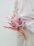 Flora is een droogboeket in pasteltinten die makkelijk blendt in een modern interieur. Het boeket werd samengesteld uit droogbloemen zoals papaver, nigella, roze cardoen en craspedia, paarse bunny tails, roze palmsun en witte ruscus en strelitzia. Flora is een klein droogboeketje van formaat en zal als geschenk voor je verpakt worden.